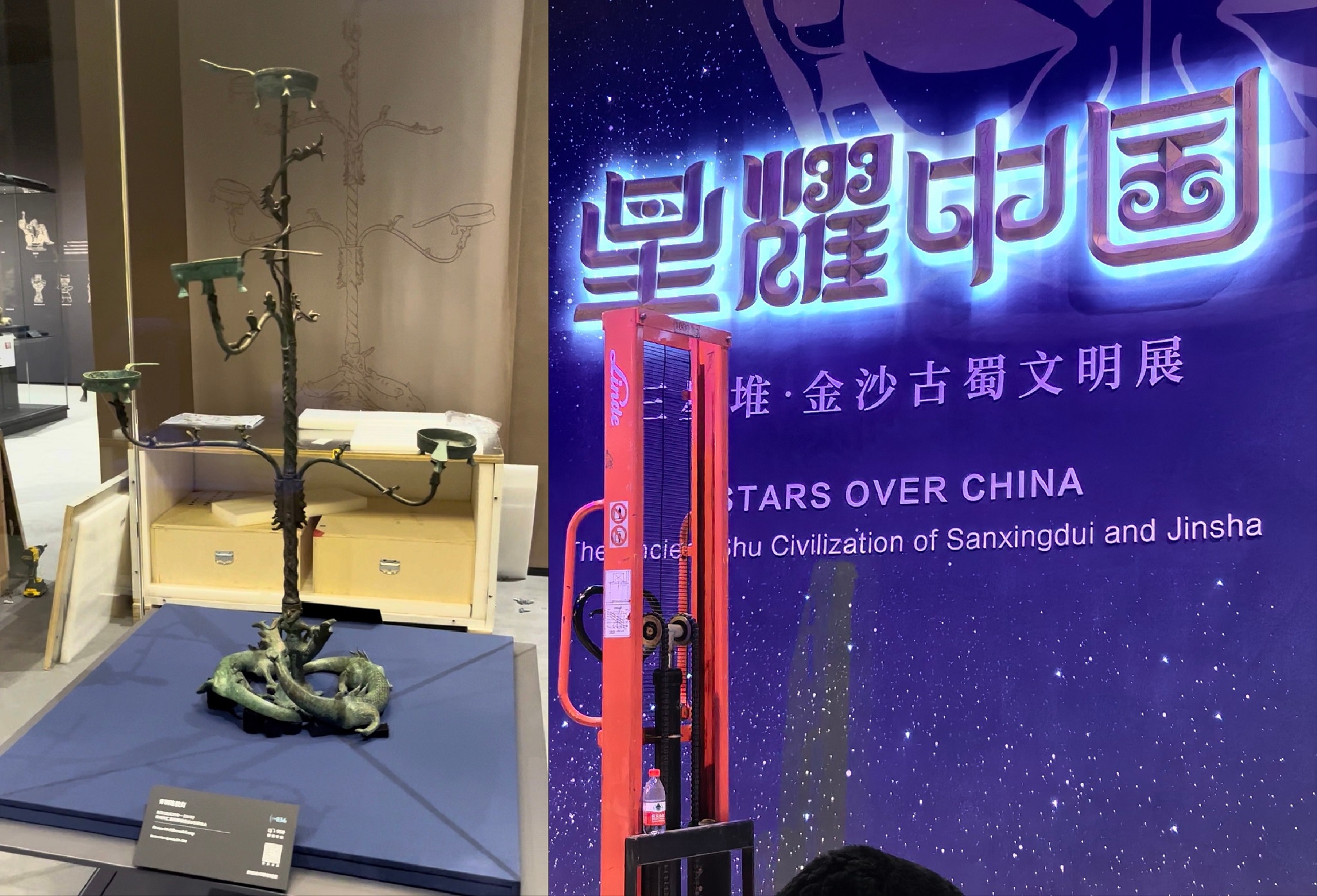 继2023年参展成都金沙遗址博物馆“吉金万里——中国西南地区青铜文明展”之后,我馆馆藏一级文物汉代青铜连枝灯于2024年2月2日正式亮相上海博物馆东馆,参加“何以中国”文物考古大展系列第三季“星耀中国——三星堆•金沙古蜀文明展”。汉代青铜连枝灯1987年出土于贵州省兴仁县雨樟镇交乐6号汉墓,通高117 厘米,由灯座、灯杆、灯枝和灯盏四大部分组成,属汉代座灯类。灯座中心底部是一只伏龟。龟背立柱,柱顶托举一跪人,赤足,凸目,高鼻,大耳,细部特征与三星堆出土的青铜跪人像颇为神似,有巴蜀遗风之貌。这盏连枝灯尽管只有五连枝,但其巧夺天工的创意和精美绝伦的工艺,却技压群芳,是贵州汉代青铜文化鼎盛时期一件瑰丽的代表作。特别是整盏连枝灯上一共铸造有15条神态各异的龙,实属全国同类型文物中罕见。