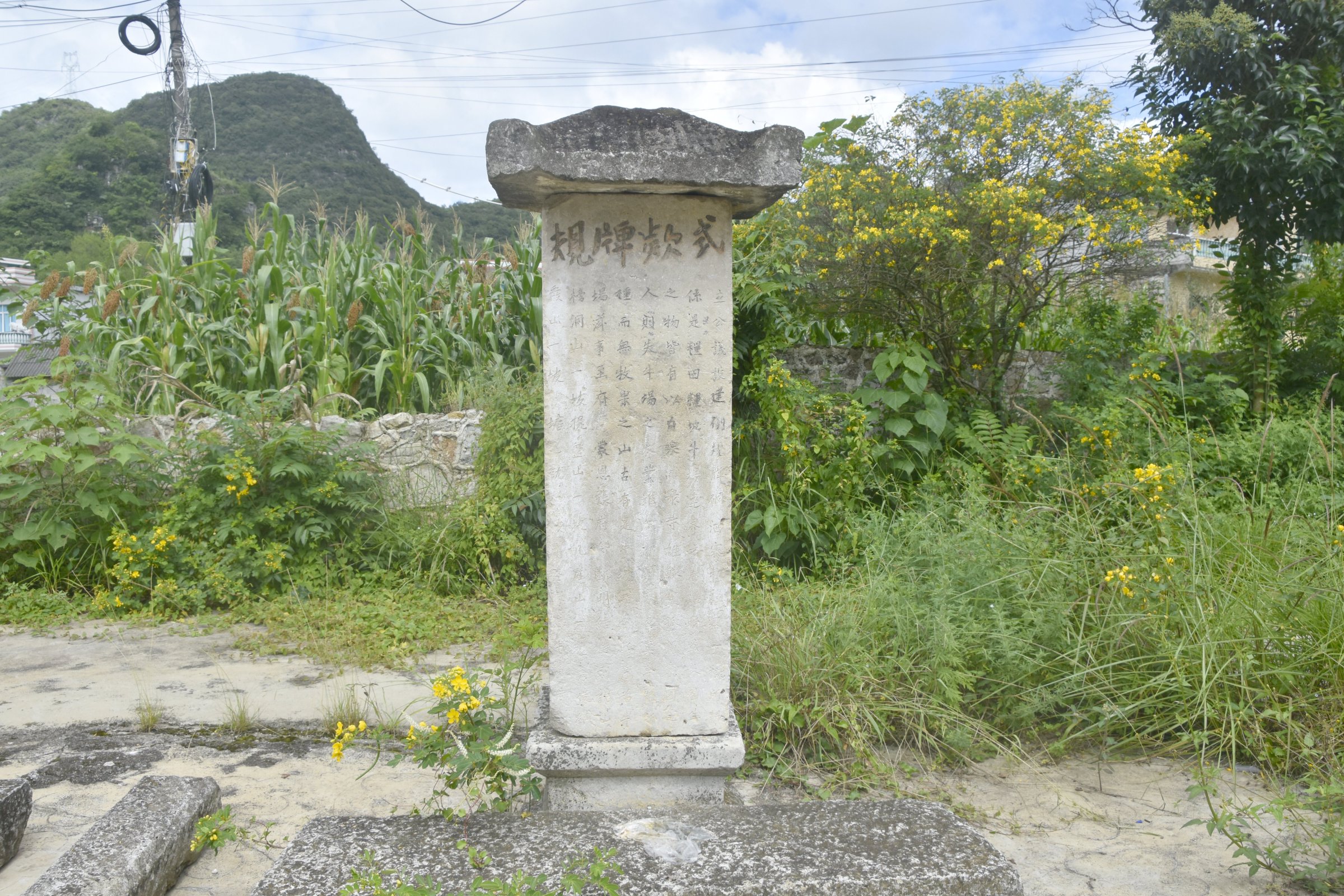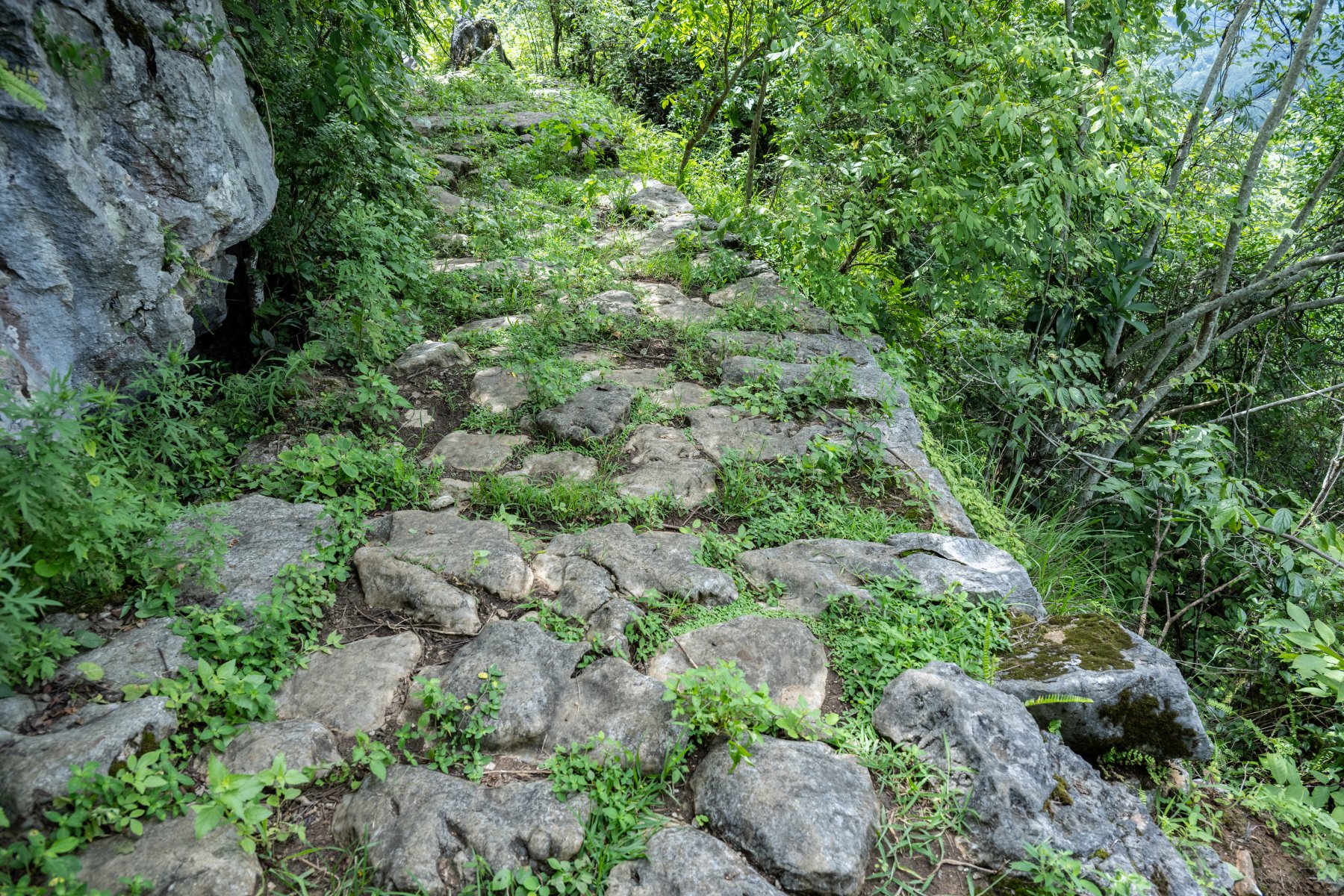 安龙县府城南路位于安龙县城南侧,北起原兴义府城西门(怀远门),经阿召、巧洞坪、大水井、板江、舍寨、幺塘、洞洒、小水井、石门关、梅子关、七道拐,南至南盘江坡脚码头,全长约30公里。道路平均宽度2.2米,主体为青石板铺砌,部分路段保留原有踏步与排水设施。整个路线穿越低山丘陵地带,海拔在800米至1500米之间,途经多个布依族村寨,如三塘村、打坐村、坡脚村等。沿线可见关隘、碑刻、古井、桥梁、驻军遗址等历史遗存。历史上府城南路是连接黔桂两省的重要通道,唐宋以来便是“战马通道”的一段,兼具了政治、经济、文化、商贸、民间往来以及战争等诸多功能。清道光年间,兴义知府张锳出资修建府城南路,郡人拔贡严以正撰文《修兴义府南路碑》,云:“兴郡壤接两粤,僻处边疆,远通羊城,近达象郡,贾商辐辏,货物骈臻。”让这条驿道的历史地位再次提升。