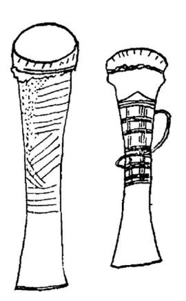 不同于于起源的学说,木鼓起源并没有从材质上着手分析铜鼓的前身,相关学者认为木鼓才是铜鼓的起源,认为在我国西南地区和东南亚地区以及太平洋岛屿地区在很久以前使用的原始木鼓可能是铜鼓的起源,因为木鼓大多数是将中间凿空在一面蒙上兽皮,暮鼓的腰身相对较细,从木鼓的腰身上可以系绳用作装饰,同时也方便佩戴和使用,这种木鼓在现阶段的云南地区仍有沿用,因此学者认为木鼓才是铜鼓的起源,只是因为后来青铜器盛行,且相较于木鼓,青铜器更为庄严肃穆,更适用于一些庄重的场合,因此逐渐的产生并大量推行铜鼓。如图所示,这种说法尚且没有推翻的数据和记录。